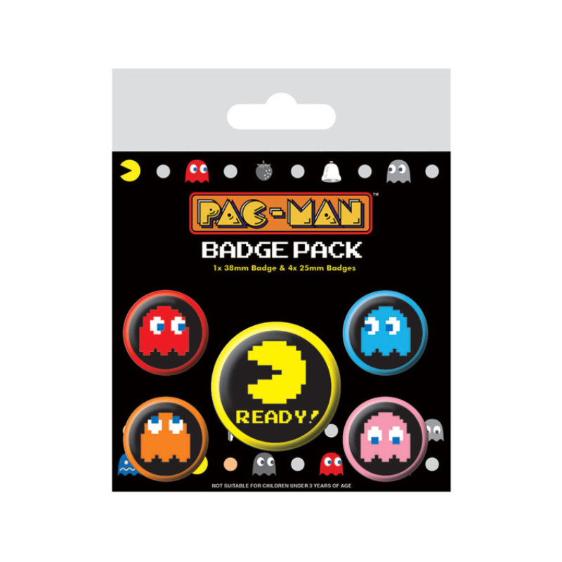 PYRAMID - Juego de chapas Pacman (Pixel) en blister con colgador. Incluye cuatro de 25mm y una de 38mm.