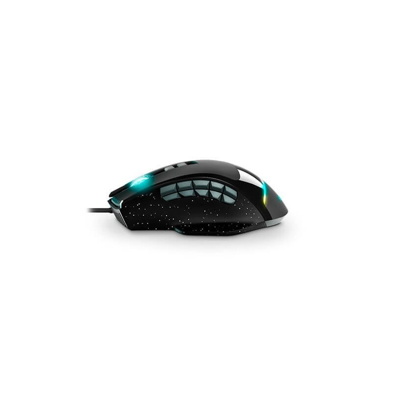 Rato com fio para jogadores exigentes com luzes RGB, peso base ajustável, 3 botões laterais intercambiáveis e até 15 botões configuráveis. Botões mecânicos intercambiáveis e configuráveis com 8/10/15 botões extra através de software. Além disso, controle o DPI do seu mouse para obter a precisão que você precisa para vencer a sua batalha.