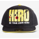 El borde de la visera y el botón superior son amarillos, dándole al conjunto un aire de lo más moderno. Y en la parte frontal tiene la inscripción HERO be your own Hero. La parte trasera incluye una correa ajustable para que no se te escape la gorra aunque haya aire.
