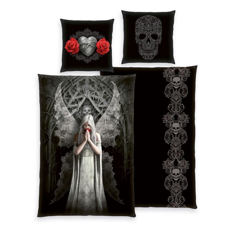 Descubra a beleza da roupa de cama Anne Stokes, um conjunto que inclui um cobertor de 135 x 200 cm e uma almofada de 80 x 80 cm, ambos confeccionados em 100% algodão para garantir maciez e conforto. Este conjunto apresenta designs góticos distintos de Anne Stokes, com ilustrações detalhadas como uma figura angelical e padrões de caveiras que criam uma atmosfera mística e elegante.