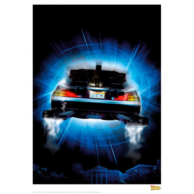 Se trata de una litografía muy elegante, que es además una edición limitada a 995 piezas en todo el mundo, por lo que viene con certificado de autenticidad. Es ideal para quienes no se conforman con decorar su casa o habitación con cualquier cosa. Su genial diseño está basado en un clásico entre los clásicos del cine de los 80: la inolvidable Regreso al Futuro, y más concretamente el icónico DeLorean, este coche tan especial que funciona a su vez como máquina del tiempo. Podemos ver al Delorean en pleno despegue y la torre del reloj de fondo.