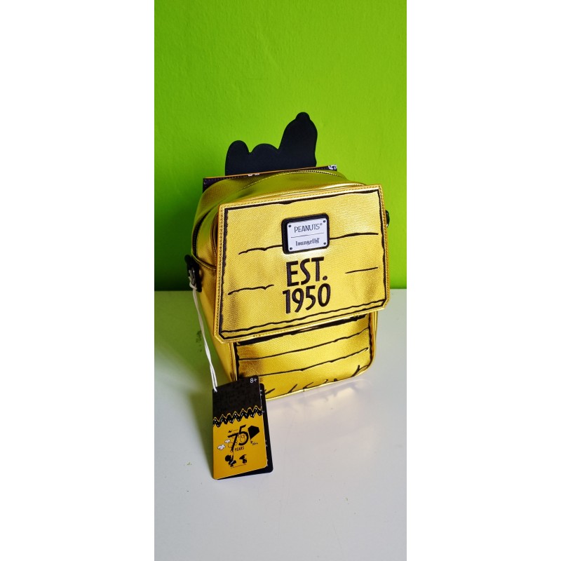 O interior da bolsa apresenta um design especial com estampados do Snoopy e o número 75, celebrando a longa história da personagem. No verso, um pormenor de impressão recorda a data de criação "EST. 1950".