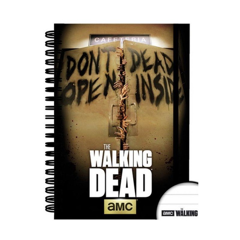 Espectacular cuaderno A5 (14.8x21cm) de tapa dura con una expectacular imagen del logo de Walking Dead y con una frase que dice" NO ABRIR, MUERTOS DENTRO" en una puerta que se abre con todo manos.