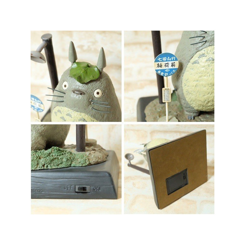 Este diorama con luz muestra una de las escenas con más pregnancia de Mi vecino Totoro: la espera al autobús junto a la parada, con la farola y con un Totoro grande y peludo que se tapa con una hoja de la lluvia.