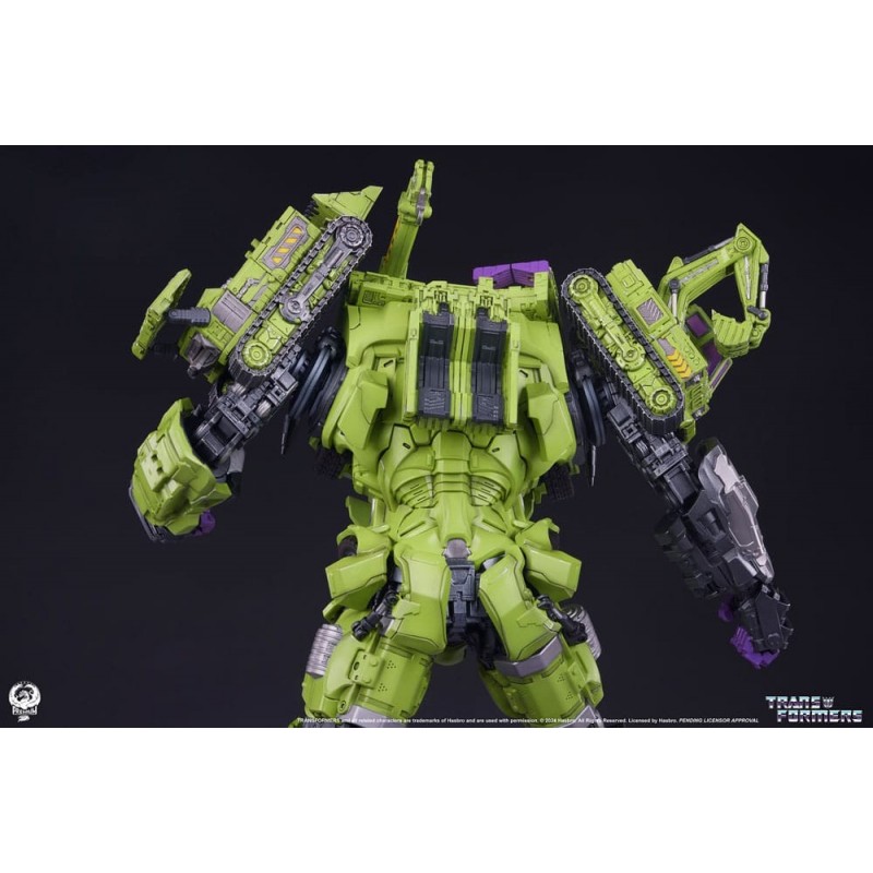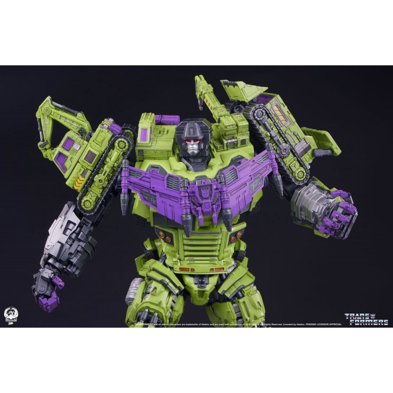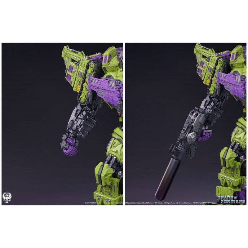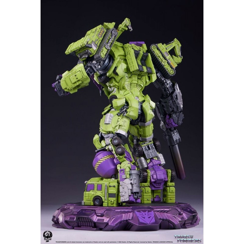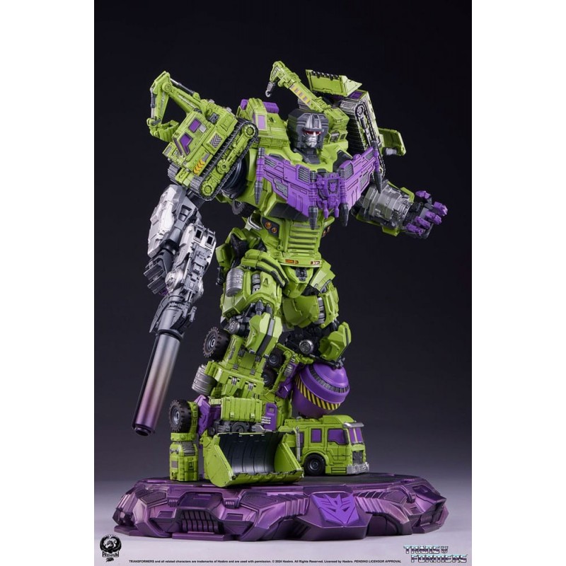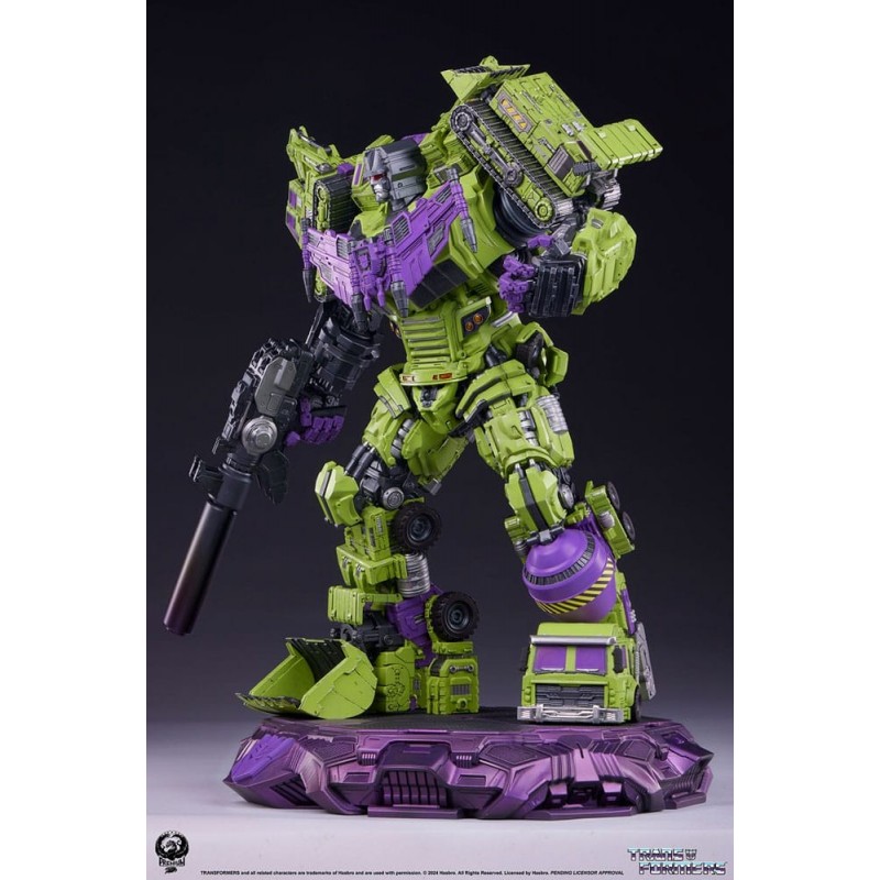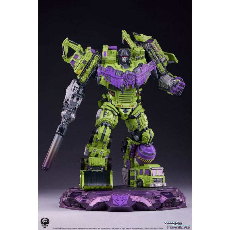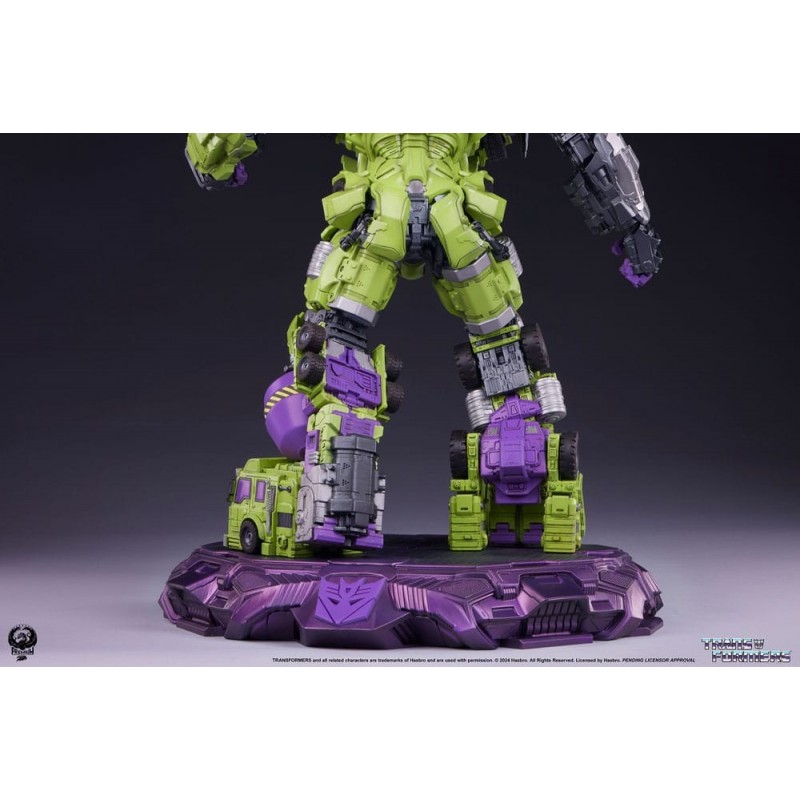 O design é meticulosamente elaborado, destacando as cores icônicas do Devastator: verde e roxo, com detalhes mecânicos que realçam sua aparência robusta e poderosa. A base onde se sustenta é adornada com motivos cibernéticos em tons roxos, acrescentando um toque adicional de autenticidade.