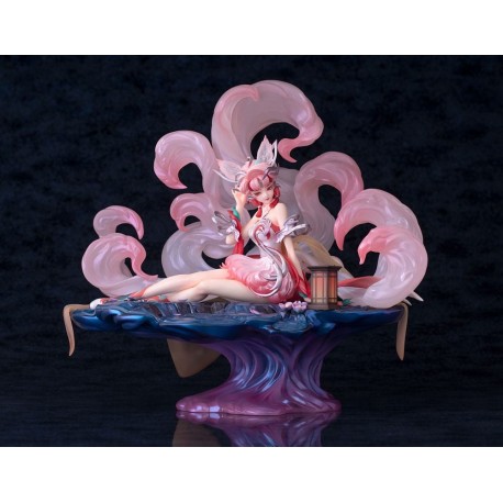 A figura mede aproximadamente 28 cm de altura e é feita de PVC de alta qualidade, oferecendo durabilidade e um acabamento requintado. O design apresenta a Qingqiu reclinada numa pose elegante, com o seu distinto cabelo cor-de-rosa e orelhas pontiagudas, rodeada por nove caudas fluidas numa cor etérea rosa e branca, dando um toque mágico à peça.