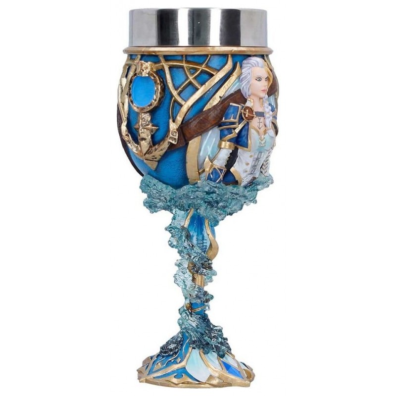 Com aproximadamente 19,5 cm de altura, esta obra-prima destaca-se pelo seu design detalhado. A figura de Jaina Proudmoore, renomada feiticeira do universo WoW, decora o cálice com tons elegantes de azul e dourado, acompanhada por detalhes intrincados que evocam seu poder mágico. Sua base simula um redemoinho de água mágica, adicionando dinamismo à peça.