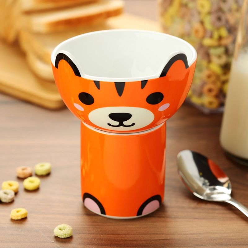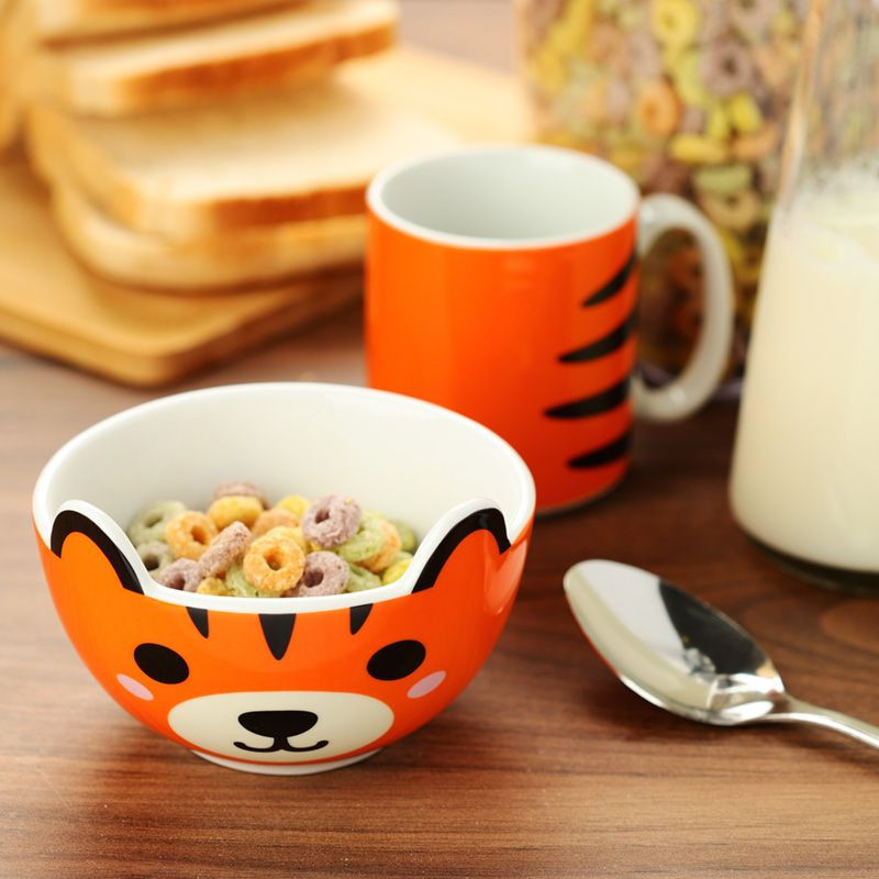 Um conjunto de tigela e caneca feito de porcelana da melhor qualidade e um design que não poderia ser mais kawaii e adorável, com a forma de um tigre muito engraçado.